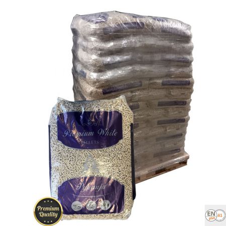 Optez pour un pellets pas cher de couleur très claire (épicéa), le pellets PREMIUM WHITE est vendu en palette de 70 sac de 15Kg pour un poids total de 1050Kg.